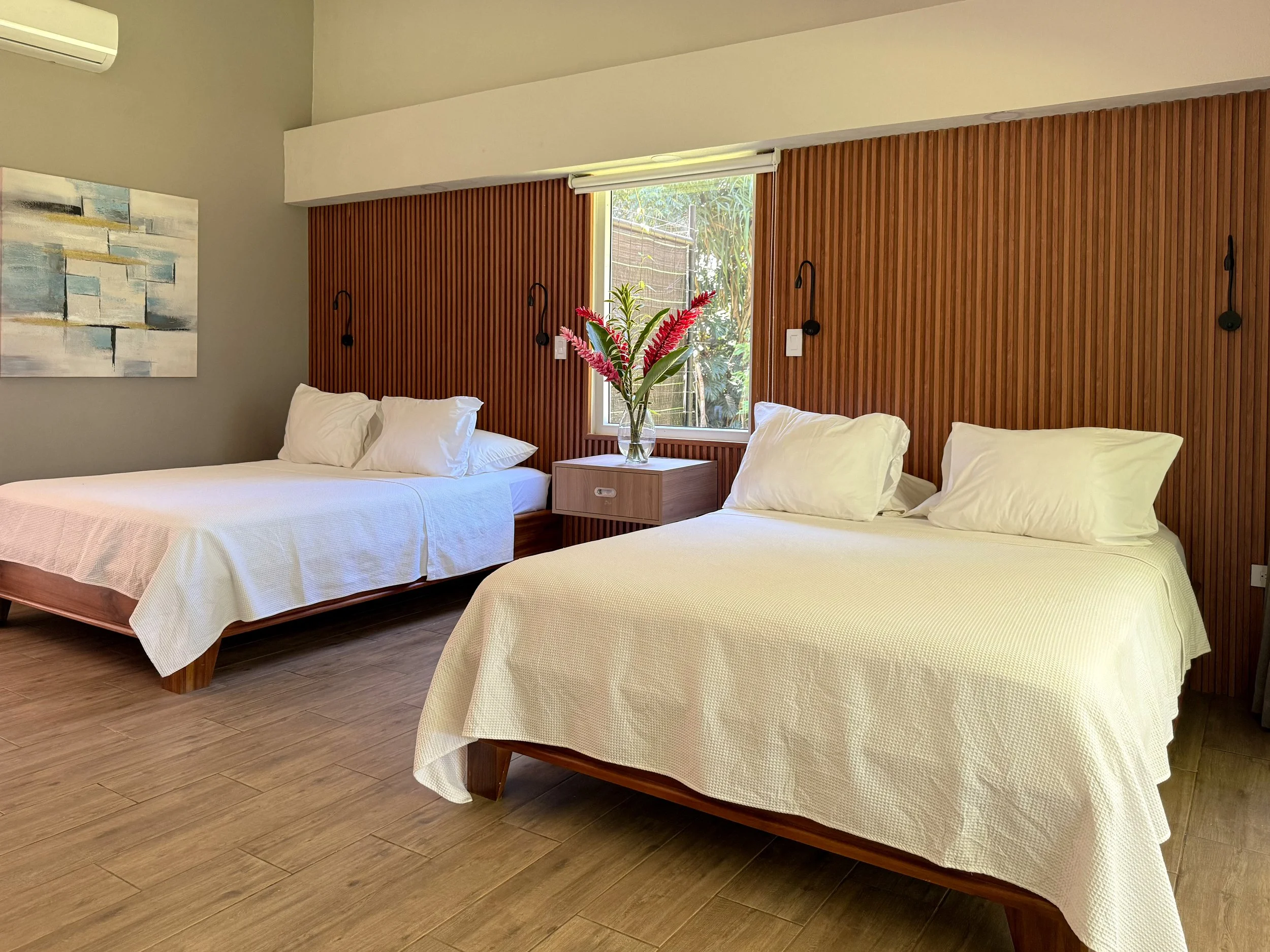 Our spacious rooms feature two queen-size beds and open onto a private terrace with views of the pool and gardens. Each bathroom is a highlight, with a serene inner garden and the option of a fully private outdoor shower. Thoughtfully equipped, our rooms ensure every stay is both comfortable and convenient.